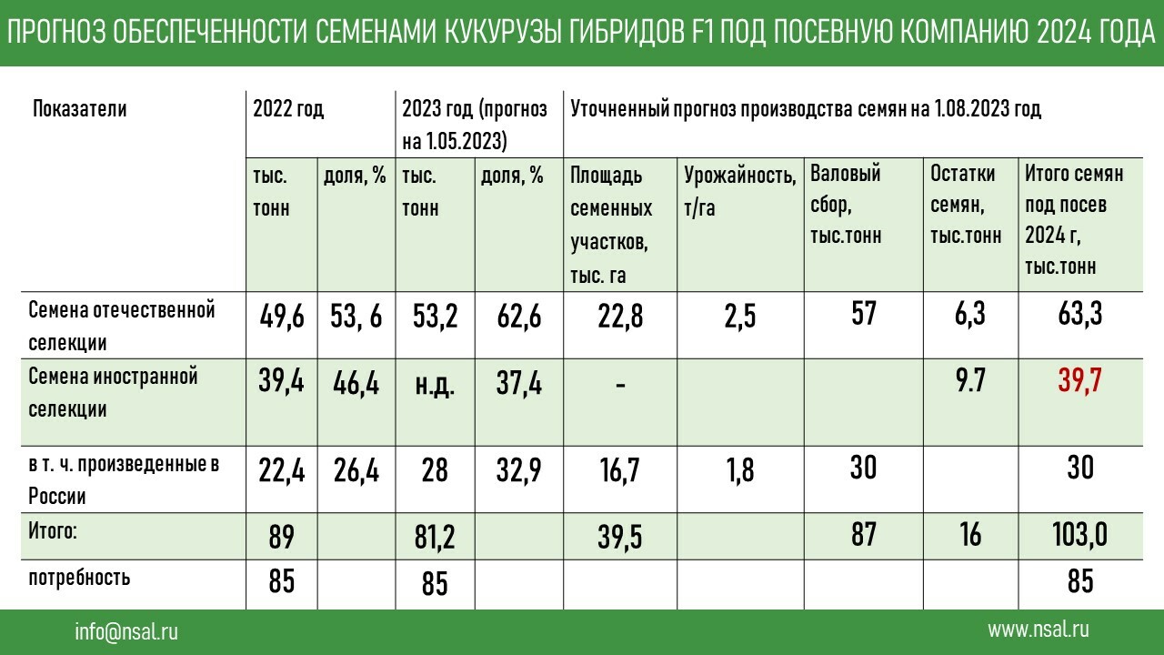 При потребности 85тыс. тонн к посевной 2024 года, на территории Российской Федерации, с учетом остатков прошлых лет и прогноза производства в России, будет находиться порядка 100-103 тыс. тонн семян кукурузы в ассортименте по группам спелости. При этом, проблемным вопросом по обеспечению семенами кукурузы на посевную 2024 года прогнозируется дефицит семян восковидной кукурузы, предназначенный для производства модифицированного крахмала. По данной нишевой разновидности кукурузы, необходима отдельная программа импортозамещения, разработанная с участием Ассоциации предприятий глубокой переработки зерна «Союзкрахмал».