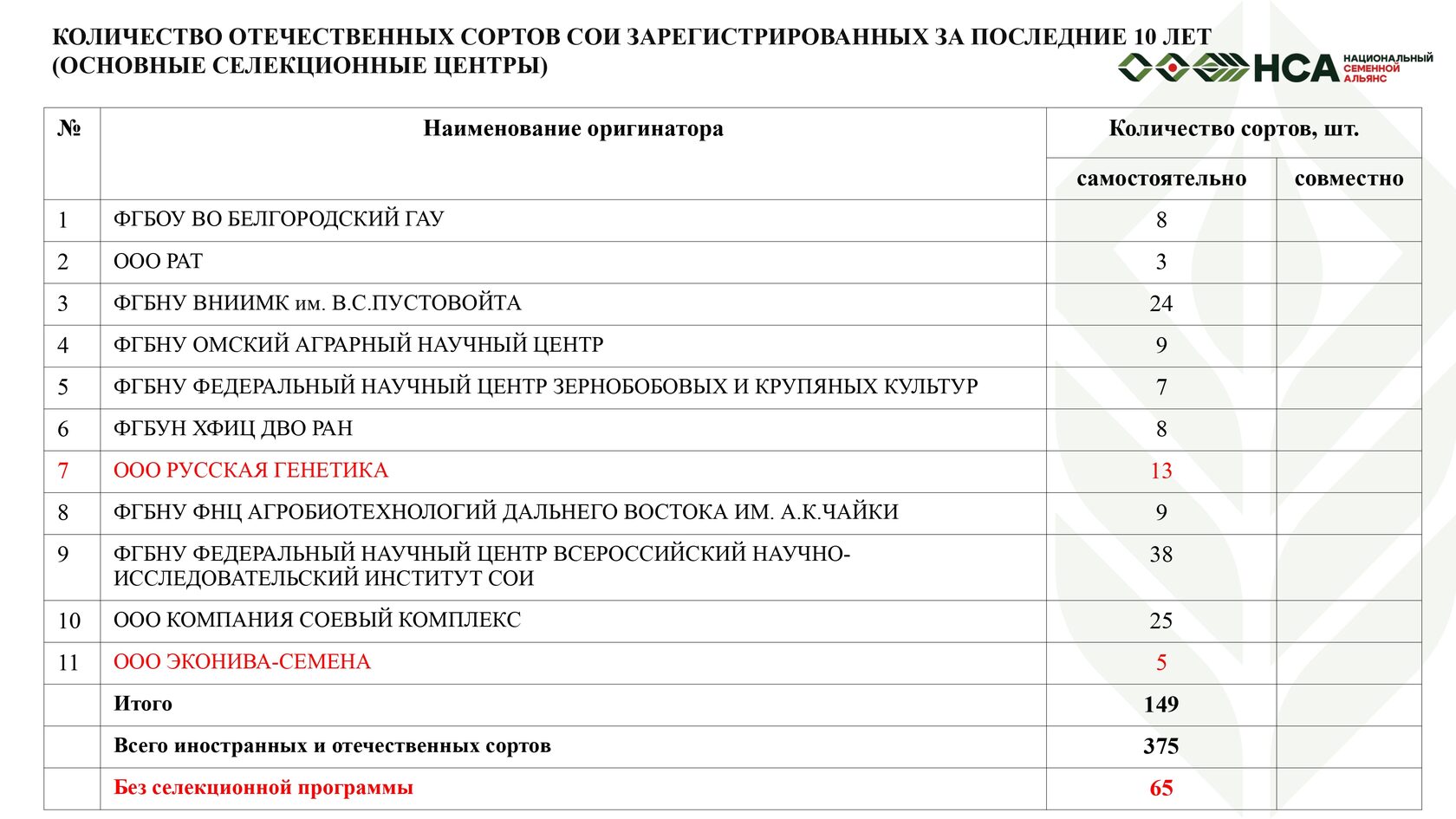 Количество отечественных сортов сои зарегистрированных за последние 10 лет