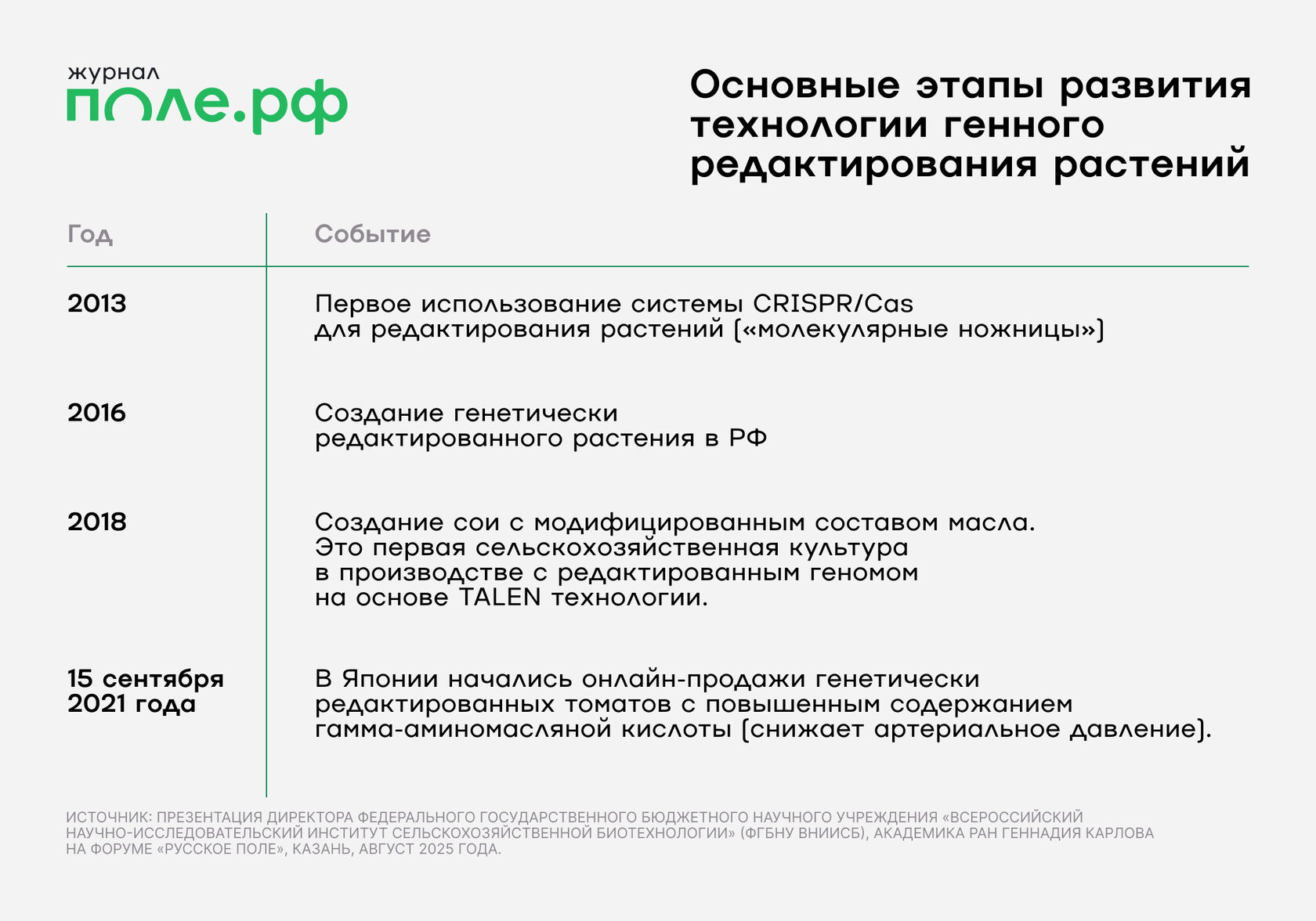 Процесс выведения нового сорта или гибрида сельхозрастения должен занимать в России не 10–12, а 2–5 лет. Такую задачу в ходе форума «Русское поле — 2025» поставила ученым министр сельского хозяйства РФ Оксана Лут. Какие технологии уже используют российские ученые, чем ГМО-культуры отличаются от ГМ-растений и что будет, если скрестить капусту с горчицей — в статье журнала Поле.РФ.
